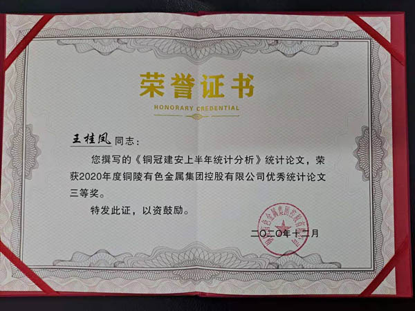 12月29日,在集團(tuán)公司統(tǒng)計(jì)工作會(huì)議上,公司獲“2020年度統(tǒng)計(jì)工作先進(jìn)單位”榮譽(yù)稱號,公司《銅冠建安上半年統(tǒng)計(jì)分析》論文榮獲集團(tuán)公司優(yōu)秀統(tǒng)計(jì)論文三等獎(jiǎng)。